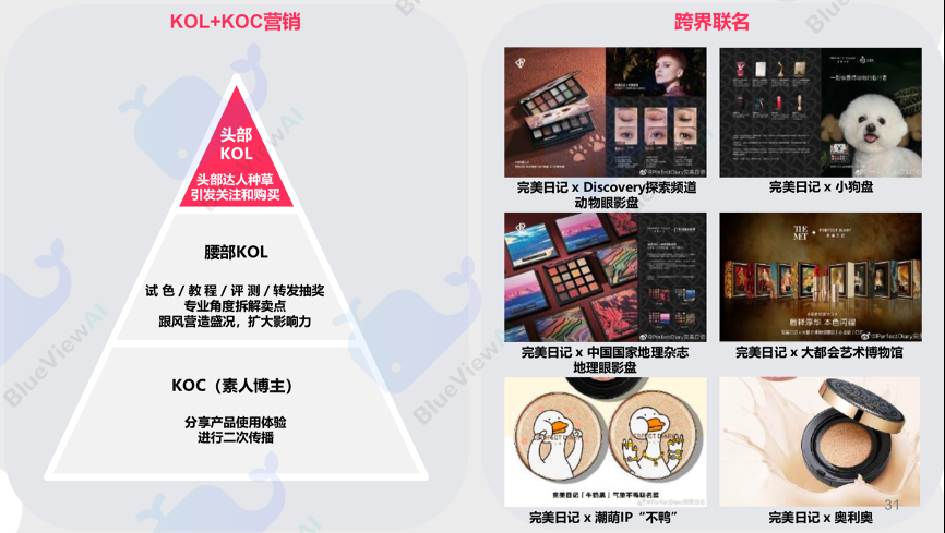 經(jīng)典案例:根據(jù)《藍(lán)色光標(biāo)-化妝品行業(yè):新國貨彩妝洞察》、公司官網(wǎng)等綜合資訊表明,在公域流量方面,完美日記通過明星合作、KOL+KOC營銷、跨界聯(lián)名進行曝光、種草,獲客和銷售; 完美日記借勢明星合作為品牌造勢引流, 通過KOL和KOC聯(lián)動吸引關(guān)注同時提升消費者體驗以及產(chǎn)品口碑,同時推出聯(lián)名產(chǎn)品,不斷給品牌賦能,為完美日記打造“完美鏈路”。