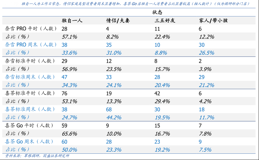 經典案例:根據草根調研、國盛證券研究所等綜合資訊表明,社交空間和溫馨氛圍吸引差異化用戶群體,根據門店調研,30-40歲家庭消費為奈雪重要消費群體。其消費特征突出:1)年齡:喜茶的用戶年齡群體明顯更加年輕,喜茶標準店與 Go 店 20-30 歲消費群體占比都在六成以上;對比之下,奈雪的用戶 30-40 歲成為主流消費群體,占比在達到五成左右。2)消費群體:奈雪店鋪消費群體中。一家人、帶小孩類的消費群體占比在周末顯著高于喜茶。