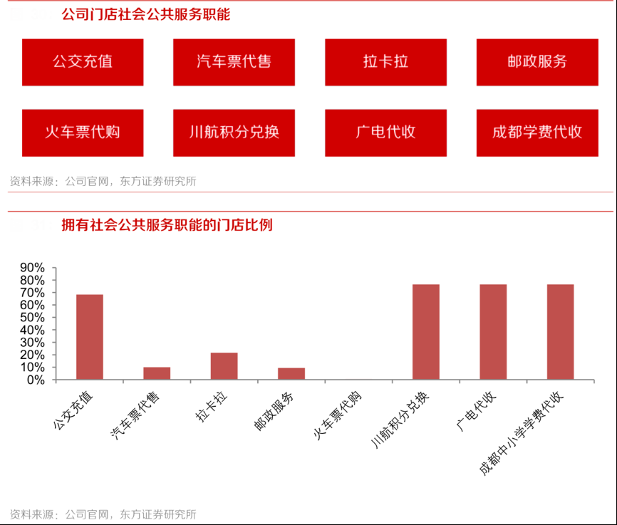 經(jīng)典案例:根據(jù)公司官網(wǎng)、東方證券研究所等綜合資訊表明,紅旗連鎖門店在銷售產(chǎn)品之外,還承擔(dān)了多項(xiàng)社會(huì)公共服務(wù)職能,其中包括公交充值、汽車票代售、、拉卡拉、郵政服務(wù)、火車票代購、川航積分兌換、廣電代收、成都中小學(xué)學(xué)費(fèi)代收。紅旗連鎖與當(dāng)?shù)厣鐣?huì)公共服務(wù)職能實(shí)現(xiàn)深度綁定,進(jìn)一步強(qiáng)化了公司門店的不可替代性,高度融入居民日常生活也能深化公司的品牌形象,鞏固公司的競爭壁壘。
