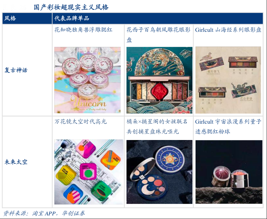 經(jīng)典案例:根據(jù)淘寶APP、華創(chuàng)證券等綜合資訊表明,人們的精神需求往往以色彩形式映射到消費(fèi)品上。參考上個(gè)世紀(jì)日本經(jīng)濟(jì)灰色蕭條時(shí)期,日本年輕人通過(guò)色彩感與個(gè)性十足的原宿風(fēng)表達(dá)自我,風(fēng)格追求非日?;?,可以說(shuō)是色彩反抗現(xiàn)實(shí)的典型風(fēng)格。國(guó)貨彩妝深諳其道,站在時(shí)間軸的兩端講述超現(xiàn)實(shí)主義:比如花西子、花知曉等產(chǎn)品呈現(xiàn)出浪漫的遠(yuǎn)古神話色彩;萬(wàn)花鏡、橘朵等則體現(xiàn)了未來(lái)太空 的前衛(wèi)和科技感。