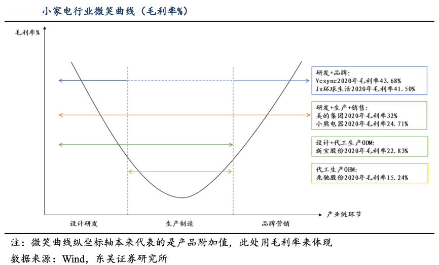 經(jīng)典案例:根據(jù)wind、東吳證券研究所等綜合資訊表明,對(duì)應(yīng)不同價(jià)值環(huán)節(jié)其利潤(rùn)水平契合微笑曲線規(guī)律,以兆馳股份為代表的純代工廠商毛利率相對(duì)處于最低水平,由生產(chǎn)環(huán)節(jié)向兩端延伸的企業(yè)如新寶、美的、小熊盈利水平漸次提升,而把控研發(fā)加品牌最高價(jià)值環(huán)節(jié)兩端的企業(yè)毛利率處于最高水平。在優(yōu)化供應(yīng)鏈環(huán)節(jié)后 JS 環(huán)球生活將重心向產(chǎn)品技術(shù)和品牌服務(wù)兩端轉(zhuǎn)移,毛利率的提升體現(xiàn)出公司策略的初見成效。