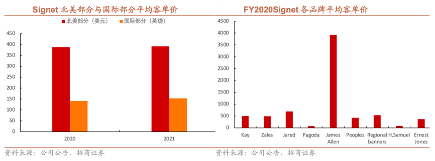 經典案例:根據公司公告、招商證券等綜合咨詢表明,Signet 大部分子品牌平均客單價在 1000 美元以下,定價較低以吸引更多的顧客,偏向“薄利多銷”。2021 財年,Signet 北美部分的客單價為 392 美元,國際部分的為 153 英鎊。Tiffany 產品單價在 3100-30 萬美元之間不等。相較于 Tiffany, Signet 客單價相對較低且每年的變化較小。