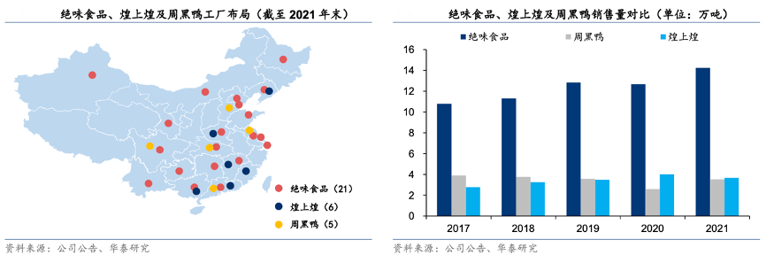 經典案例:根據公司公告、華泰研究等綜合資訊表明,2021年絕味銷售量達 14.2 萬噸,遠高于煌上煌/周黑鴨的3.7/3.5 萬噸。銷售規模優勢下其已形成全國化 工廠及終端門店先發布局優勢。生產端,至 21 年末其已在全國范圍內建立了 21 個生產基地(2 家在建),同期煌上煌/周黑鴨工廠數為6/5個;銷售端,絕味食品2021年年報顯示,至2021年末,其門店數達 13714 家,已覆蓋至國內 31 個省級行政區域,且在各省級區域均具備一定市場影響力。