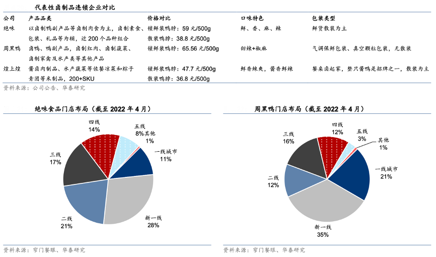 經典案例:根據公司公告、窄門餐眼、華泰研究等綜合資訊表明,絕味食品通過供應鏈+性價比的優勢閉環構建產品競爭力,從定價上看,絕味 500g 鴨脖散裝/鎖鮮裝定價分別為 38.8/59.0 元,均低于周黑鴨鎖鮮裝鴨脖的65.6 元,略 高于煌上煌,產品定價端具備一定優勢。
