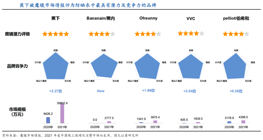 經典案例:根據魔鏡市場情報、《2021年度中國線上高增長消費市場白皮書》、國元證券研究所等綜合資訊表明,結合灼識咨詢 2021 年 11 月進行的消費者調研,蕉下約 70%的客戶在購買后通過社交媒體或者口口相傳的方式向朋友 和家人推薦公司的產品以及品牌。魔鏡市場情報 2021 年度的《中國線上高增長消費市場白皮書》中同樣將蕉下作為防曬衣的重點品牌,認為蕉下的品牌競爭力以及潛力均超過同賽道品牌。
