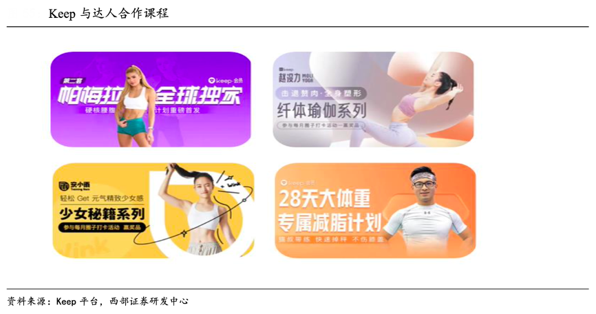經典案例:根據Keep平臺、西部證券研發中心等綜合資訊表明,Keep將提供運營分析,幫助達人更好地了解粉絲的喜好,并提供與平臺合作制作優質內容的機會。對于高人氣和富有創意的達人,Keep 會將他們直接介紹給廣告主,以擴大他們的變現機會。截至 2021 年 12 月 31 日,健身達人,健身專業人士和內容提供商有 7600 個健身課程在 Keep 平臺上。