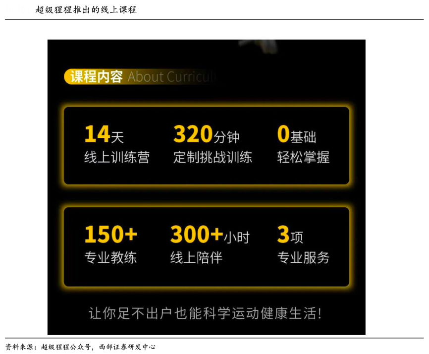 經典案例:根據超級猩猩、西部證券研發中心等綜合資訊表明,以超級猩猩為例,2020年 1 月 31 日,在抖音推出了第一場直播,在線人數超過了 17 萬;同年 2 月 10 號,其正式宣布推出 14 天線上「陪」訓營,通過教練組建企業微信班級群的方式,提供飲食建議和定制訓練計劃的服務。