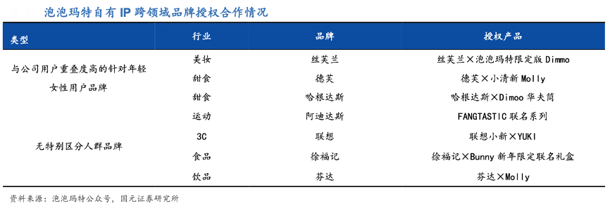 經典案例:根據泡泡瑪特公眾號、國元證券研究所等綜合資訊表明,以泡泡瑪特為例,其于 2019 年底至 2020 年初在中國七大城市連續舉辦以熱門 IP 為核心的主題展,在此期間宣傳、促銷節日或地區限定產品;與絲芙蘭、德芙、哈根達斯、阿迪達斯運動、徐福記、芬達等多行業品牌推出聯名商品,提升 IP 知名度。