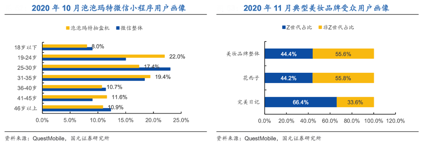 根據 QuestMobile 數據,2020 年 10 月泡泡瑪特抽盒機微信小程序用戶中 24 歲及以下年齡用戶占比 3 0%;2020 年 11 月完美日記用戶中 Z 世代用戶占比66.4%。