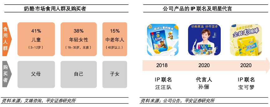 經典案例:根據艾瑞咨詢、公司公告、平安證券研究所等綜合資訊表明,2018年,妙可藍多公司與知名動漫 IP “汪汪隊”進行聯名合作,主要看中“汪汪隊”在兒童群體中的高熱度;2020 年,公司聘請孫儷為品牌代言人,主要瞄準寶媽群體,同時攜手精靈寶可夢這一在 80、90 后心中極具份量的IP,推出金裝奶酪棒。