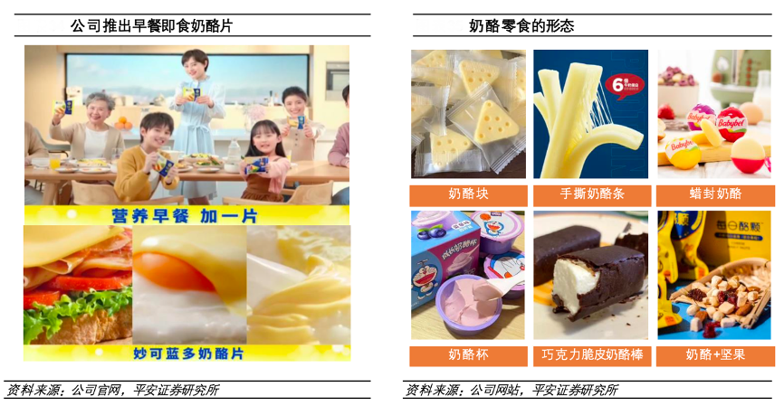 經典案例:根據公司官網、公司網站、平安證券研究所等綜合資訊表明,2021年,妙可藍多公司在早餐消費場景,創新性地推出了香甜口味的奶酪片,為奶酪產品進入家庭餐飲開辟了新路徑。該產品與中西式早餐均能搭配,既能添加在西式包點中,也能添加在中式粥品中,提高早餐的營養價值。為推廣該產品,妙可藍多攜手代言人孫儷打造了全新的奶酪片廣告,主推“營養早餐加一片”的食用方式,使奶酪片產品受到更多家庭的關注與喜愛。