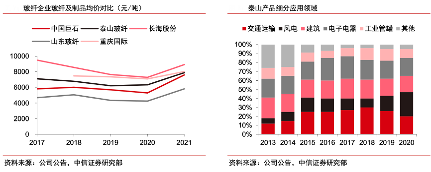 經典案例:根據公司公告、中信證券研究部等綜合資訊表明,中材科技公司產品均價高于行業平均水平,一方面是公司有部分玻纖制品,附加值價高;另一方面是公司在高端領域(風電、交通運輸、電子)的產品占比較高,尤其是風電及高端交通運輸、電子布領域具備技術壁壘和客戶粘性,行業競爭格局優異,價格穩定性高,盈利水平好。