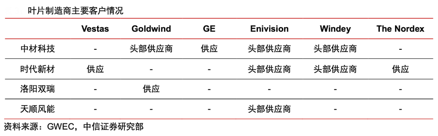 經典案例:根據GWEC、中信證券研究部等綜合資訊表明,中材科技公司主要客戶均為全球前 15 強大中型風電主機廠,主要包括 Goldwind、GE、Enivision、Windey 等。其中,核心客戶為金風科技,曾獲得金風科技“最佳供應商”、“優秀服務獎”、“供應鏈綠色度五級供應商”稱號,2020年該客戶貢獻收入占公司風電葉片收入的49%。