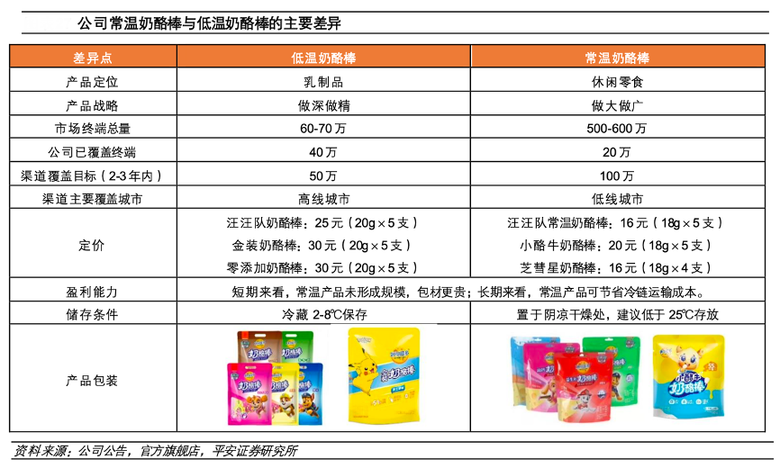 經典案例:根據公司公告、官方旗艦店、平安證券研究所等綜合資訊表明,妙可藍多公司在 2021 年 9 月推出常溫奶酪棒產品,通過兩年多時間的研發,解 決了低溫奶酪棒需要全程冷鏈的痛點,極大地拓展了兒童奶酪棒品類的消費場景。常溫奶酪棒可滲透市場空間比低溫奶酪棒更為廣闊,其在全渠道推廣上大有可為,走出冷藏冰柜的常溫奶酪棒食用場景更加多元。