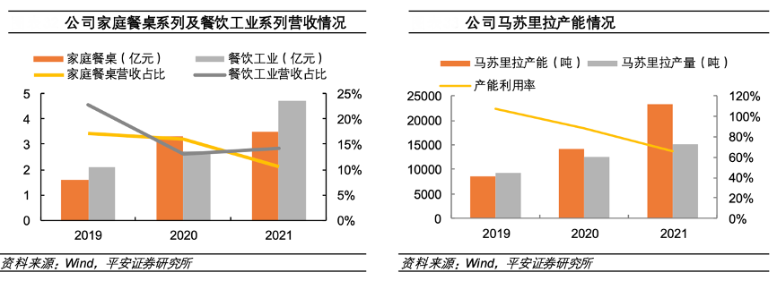 其提出“餐飲進(jìn)中餐”,從年輕一代入手培養(yǎng)國人的奶酪消費(fèi)習(xí)慣。經(jīng)過2021 年的產(chǎn)能擴(kuò)張,目前公司馬蘇里拉奶酪的產(chǎn)能基本充足,產(chǎn)能利用率為65.41%,為公司推動(dòng)“餐飲進(jìn)中餐”提供了產(chǎn)能保證。