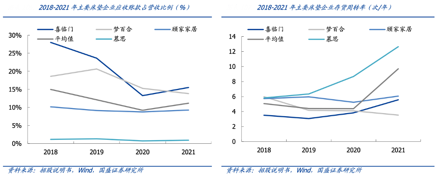 經典案例:根據招股說明書、wind、國盛證券研究所等綜合資訊表明,慕斯生產管理能力突出,以銷定產,優化庫存。其主要銷售自主品牌,且智能決策管理平臺通過集成 CRM、SAP、APS、MES 等系統,打通訂單一體化生產流程,并支持按需定制 C2M 商業模式,可以根據客戶需求迅速做出反應并進行排產,因此公司存貨周轉效率明顯高于可比公司,2021年公司存貨周轉率 12.64 次 /年,顯著高于喜臨門 5.56 次/年、夢百合 3.52 次/年,顧家家居 6.05 次/年。