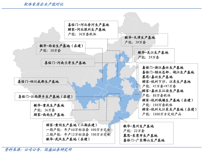 經典案例:根據公司公告、國盛證券研究所等綜合資訊表明,慕斯在供應鏈方面,通過集成 WCS 和 WMS 系統,有效提高快速供貨能力,提高生產效率、縮短交貨周期、降低生產成本,2021年公司獲授“數字化轉型大獎-標桿工廠”;產能方面,目前主要軟體家居企業均已實現全國化產能布局,喜臨門七大生產基地(不含在建萍鄉基地)更能滿足訂單及時響應需求。