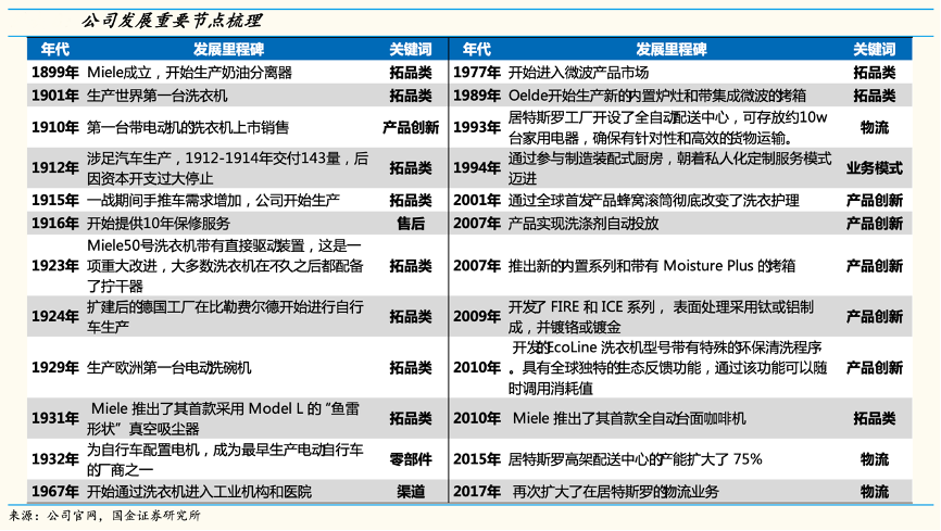 經典案例:根據公司官網、國金證券研究所等綜合資訊表明,Miele公司明確定位為“世界領先的廚房、洗衣、地板護理優質電器供應商+提供商業解決方案”。其自成立起的經營理念為 Immer Besser,即“追求極致,永遠更好”。定位和理念的執行演化為公司強勁的產品研發能力,其研發出世界第一臺洗衣機(1901)、電動洗衣機 ( 1 9 10)、歐洲第一臺洗碗機(1929)、全球第一臺家用干衣機。