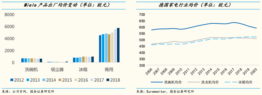 經典案例:根據公司官網、Euromonitor、國金證券研究所等綜合資訊表明,從 2018 年的出貨均價及 12-18 年均價CAGR 看:洗護(716 歐元,+0.2%)、洗碗機(665 歐元,-0.2%),基本保持平穩,主要源于過早的奠定奢侈品級定位,前期價格已經較高。吸塵器(158 歐元,+4.5%)、冰箱(985 歐元,+3.6%)、商用電器(5793 歐元,+4.1%),出貨價格有較明顯增長。