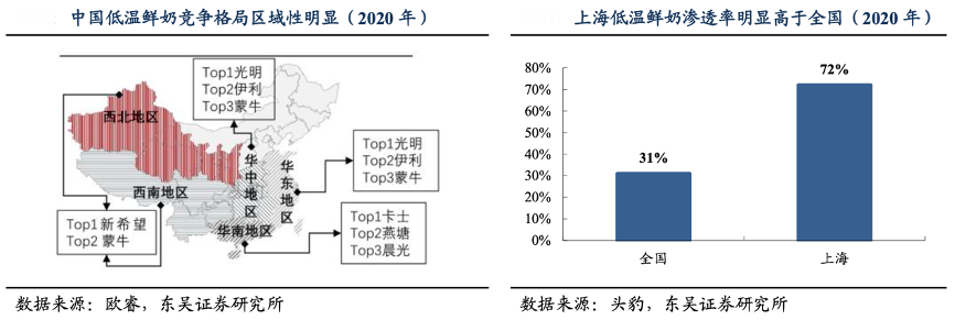 經典案例:根據歐睿、頭豹、東吳證券研究所等綜合資訊表明,低溫鮮奶對品質要求高,以奶源地為圓心,冷鏈為半徑的區域性特征明顯。得益于先發布局,光明在華東區域以鮮奶起家,品牌力強勁,護城河高;而西北區域的鮮奶龍頭為新希望,華北地區消費者偏愛三元。2020年,上海的鮮奶滲透率已達72%,遠高于全國平均的31%。