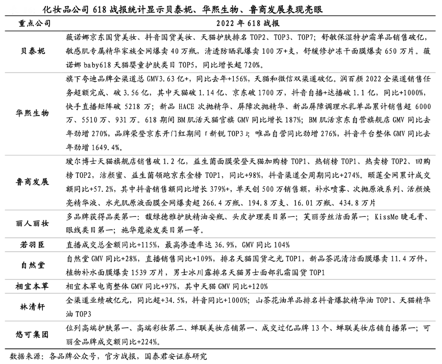經典案例:根據各品牌公眾號、官方戰報、國海證券研究所等綜合資訊表明,貝泰妮旗下薇諾娜在維持穩定價格體系下天貓 GMV 超 4 億,位列天貓 護膚 TOP7,同比+30-50%維持較快增長,明星單品凍干面膜、防曬 2 支裝、特護霜 2 支裝月銷量 10w+、10w+、6w+,抖音 GMV 超 4000 萬元, 同比翻倍以上增長。