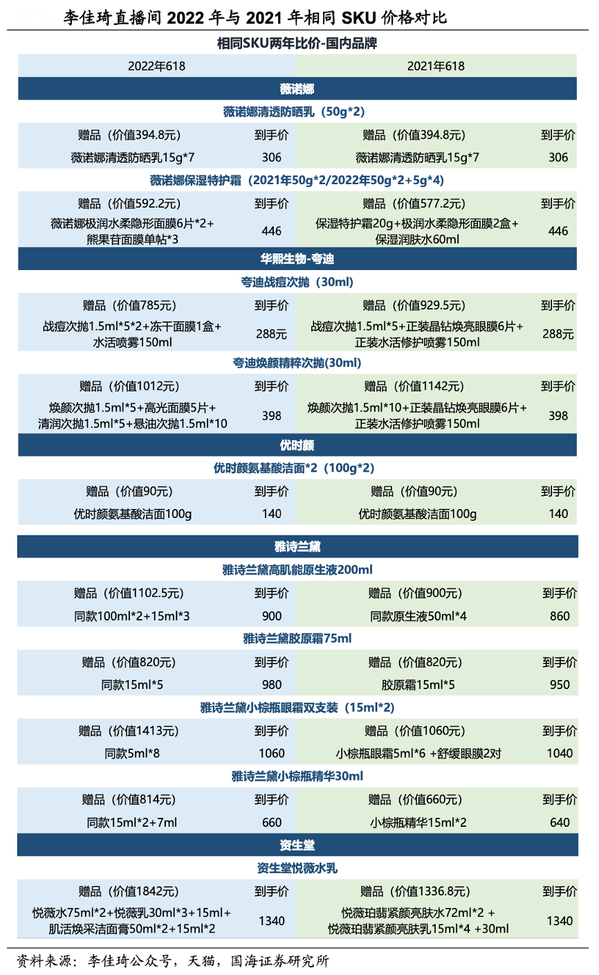 經典案例:根據李佳琦公眾號、天貓、國海證券研究所等綜合資訊表明,和往年 618 大促相比,2022年品牌普遍折扣力度更大,主要是以加大贈品價值的形式。受到2021年下半年部分品牌漲價的因素影響,部分 SKU 到手價格可能會高于 2021 年 618 大促價格,但由于品牌加大贈品力度,總體而言,最終的折扣力度依然大于 2021 年618 活動折扣力度。