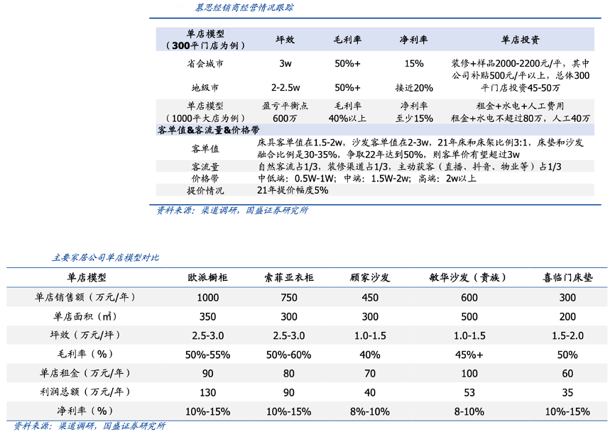 經(jīng)典案例:根據(jù)渠道調(diào)研、國盛證券研究所等綜合資訊表明,慕思兩湖地區(qū)某經(jīng)銷商單店坪效超過 2 萬元,毛利率超過 50%、凈利率 15%-20%,單店效益領(lǐng)先于各大家居企業(yè),主要系慕思具備品牌溢價(jià)屬性、產(chǎn)品定價(jià)高,且經(jīng)銷商管理體系較為完善所致。