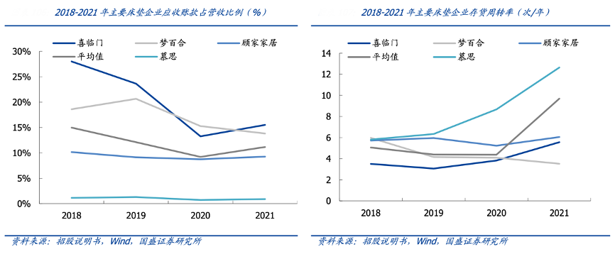 經(jīng)典案例:根據(jù)招股說明書、wind、國盛證券研究所等綜合資訊表明,慕思公司主要銷售自主品牌,且智能決策管理平臺(tái)通過集成 CRM、SAP、APS、MES 等系統(tǒng),打通訂 單一體化生產(chǎn)流程,并支持按需定制 C2M 商業(yè)模式,可以根據(jù)客戶需求迅速做出反應(yīng)并 進(jìn)行排產(chǎn),因此公司存貨周轉(zhuǎn)效率明顯高于可比公司,2021 年公司存貨周轉(zhuǎn)率 12.64 次 /年,顯著高于喜臨門 5.56 次/年、夢(mèng)百合 3.52 次/年,顧家家居 6.05 次/年。