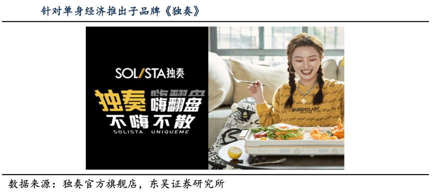 經典案例:根據艾媒數據中心、獨奏官方旗艦店、東吳證券研究所等綜合資訊表明,九陽針對年輕單身用戶打造《獨奏》子品牌搶占單身人群的新興市場,“致力于為當代年輕人提供全套生活解決方案”。
