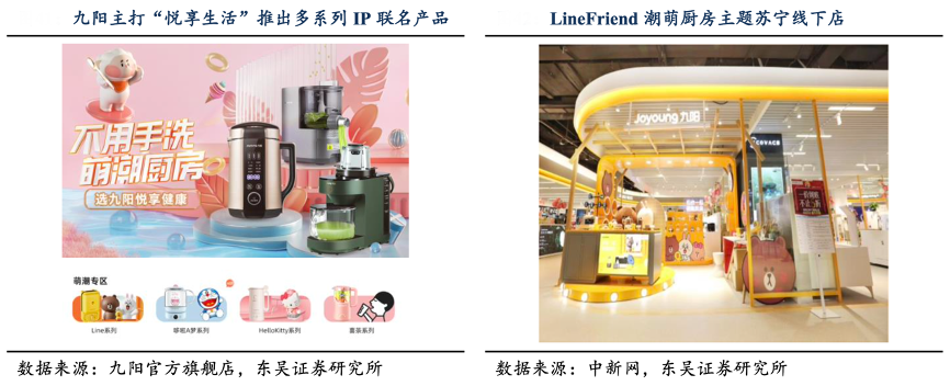 經典案例:根據九陽官方旗艦店、中新網、東吳證券研究所等綜合資訊表明,為進一步抓住趨勢順應年輕化消費群體崛起趨勢,九陽與潮萌品牌進行跨界 IP 合作,推出以LineFriends為代表的潮萌小家電,打造“高顏值”產品,滿足千禧一代消費群體為代表的新需求,建立文化認同與品牌共鳴。