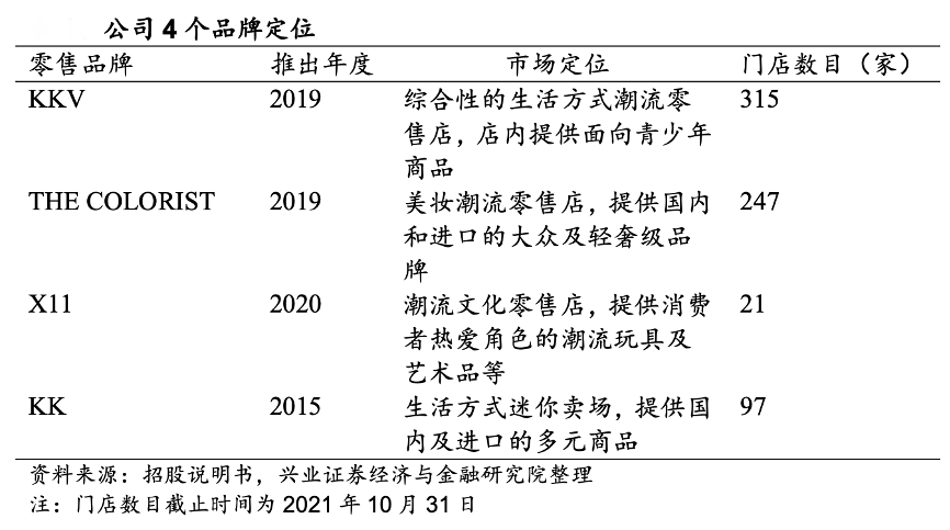 經(jīng)典案例:根據(jù)招股說(shuō)明書(shū)、興業(yè)證券經(jīng)濟(jì)與金融研究院等綜合資訊表明,KK集團(tuán)公司以“四個(gè)零售品牌”向消費(fèi)者提供橫跨 18 個(gè)主要品類中超過(guò) 20,000 個(gè) SKU 的各種潮流產(chǎn)品,涵蓋美妝、潮玩、食品及飲品、家居品、文具等所有主要核心生活用品類別,實(shí)現(xiàn)廣大的消費(fèi)者觸及。