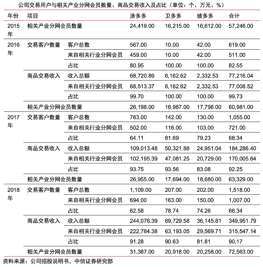 經典案例:根據公司招股說明書、中信證券研究部等綜合資訊表明,國聯資源網歷經十余年的發展,在垂直產業鏈積累了深厚的行業認知和上下游資源,錘煉了有深刻行業理解的團隊;多多電商受益于國聯資源網的用戶的有效轉化。在涂多多、衛多多、玻多多發展初期,80%以上的客戶來自國聯資源網相關分網,且這部分客戶的購買力更強,交易額高于平均水平。