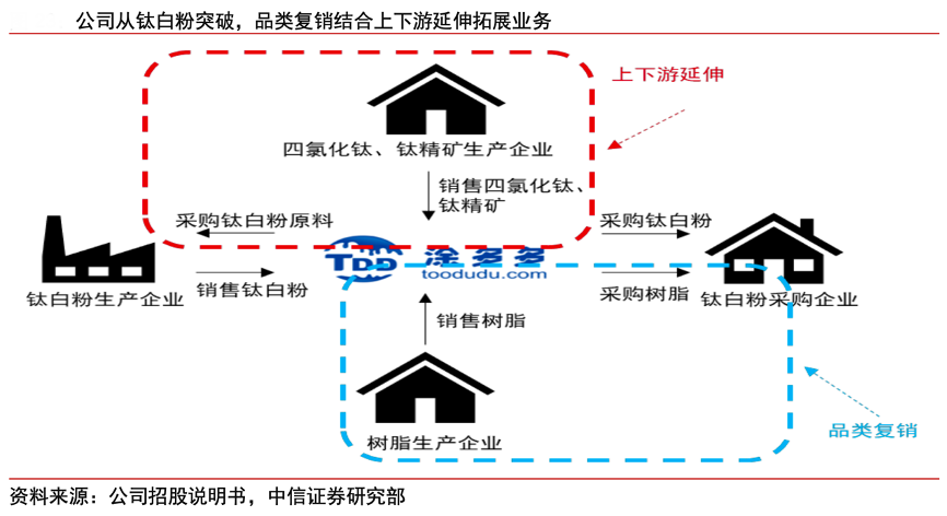 經典案例:根據公司招股說明書、中信證券研究部等綜合資訊表明,國聯股份涂多多在進入鈦行業時,先將鈦白粉作為核心單品進行突破,發展了一批鈦白粉生產上游企業和需要鈦白粉的塑料、涂料生產的下游企業作為客戶。公司在采購銷售鈦白粉的基礎上,與鈦白粉生產商建立了良好的合作關系,捕捉到鈦白粉生產商對四氯化碳和鈦精礦等產品的需求,從而將四氯化碳和鈦精礦納入涂多多的采購體系,低成本擴展公司業務和客戶。