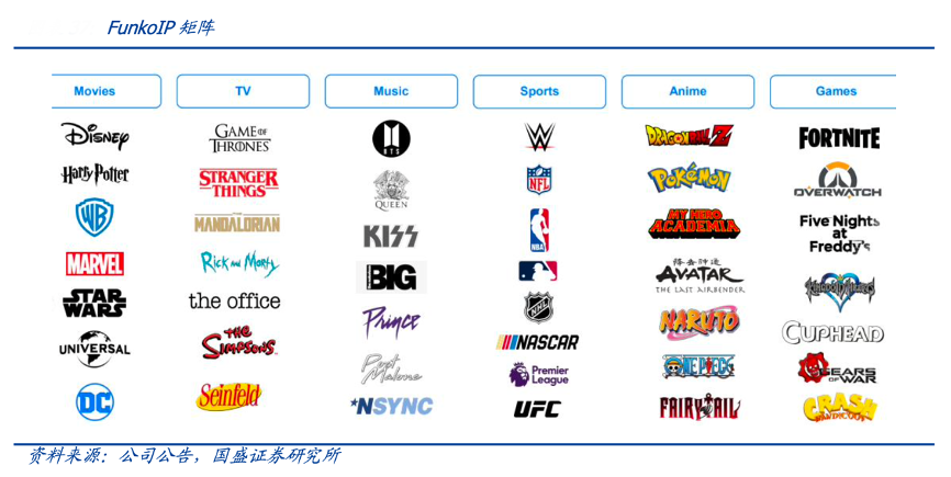 經(jīng)典案例:根據(jù)公司公告、國(guó)盛證券研究所等綜合資訊表明,F(xiàn)unko產(chǎn)品產(chǎn)品矩陣縱向搭建品牌類(lèi)型——POP!、Loungefly以及其他品牌,橫向構(gòu)建產(chǎn)品類(lèi)型——人偶以及其他衍生品(服飾、文創(chuàng)等),通過(guò)大量國(guó)際化 IP 填充矩陣內(nèi)容,拓寬領(lǐng)域延伸產(chǎn)品產(chǎn)業(yè)鏈。Funko 產(chǎn)品授權(quán)涵蓋影視、音樂(lè)、體育、游戲、動(dòng)漫多 領(lǐng)域的頭部 IP,其中漫威、哈利波特以及曼達(dá)洛人系列常居 2021 各季度 TOP3。