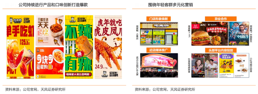 經典案例:根據公司官網、天風證券研究所等綜合資訊表明,周黑鴨2020年以來,推出了藤椒,五香和山胡椒等新口味,蝦球和鳳爪等爆款產品市場認可度價高,2021 年蝦 球、五香鴨脖月銷量破千萬。公司通過“小黃店” 門店形象煥新,與 KFC 跨界合作,植入電影《中國醫生》,近店媒體推廣,抖音小紅書等 平臺投放,全方位年輕化品牌形象,有利于公司進一步增加品牌認可度,增加消費。