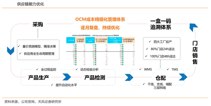 經典案例:根據公司官網、天風證券研究所等綜合資訊表明,周黑鴨公司引入 OCM 成本控制精細管理體系,進一步優化噸均生產成本,有效提高毛利率。其以地理區劃整體布局五大生產中心,目前已設有四個生產工廠,預計華西工廠在 2022 年投入運營,產能整體提升,生產中心間可以靈活調配產能,應對區域城市風險。