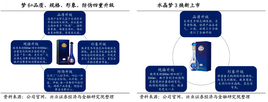經典案例:根據公司官網、興業證券經濟與金融研究院等綜合資訊表明,洋河夢6+實現品質、規格、形象、防偽四重升級。品質上,夢6+選用頭排酒并增加陳年老酒的使用量,酒體更加厚重醇香;規格上產品容量從 500ml 增加至 550ml,性價比凸顯;形象上基礎瓶型不變,但對色彩搭配和瓶身圖案進行優 化,塑造高端精品的典雅氣質;防偽上以高科技手段實現開箱、開盒、開瓶 的防偽,保證消費者購買和飲用的安全性。隨著主導大單品夢6+成功升級進入高速發展階段,水晶夢 3 重點從品質、規格、形象跟隨升級。