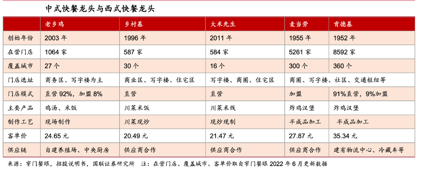 經典案例:根據窄門餐眼數據、招股說明書 、國聯(lián)證券研究所等綜合資訊表明,目前肯德基、麥當勞門店規(guī)模超 5000 家,覆蓋城市超 300 個,西式快餐的規(guī)模優(yōu)勢得益于標準化程度,從產品看,麥肯產品工業(yè)化程度較高,門店操作簡單標準;從管理看,麥肯具備標準化的加盟模式,擁有完備的選址標準和豐富管理經驗;從供應鏈看,麥肯深耕中國市場多 年,形成穩(wěn)定完善的西式快餐供應鏈。