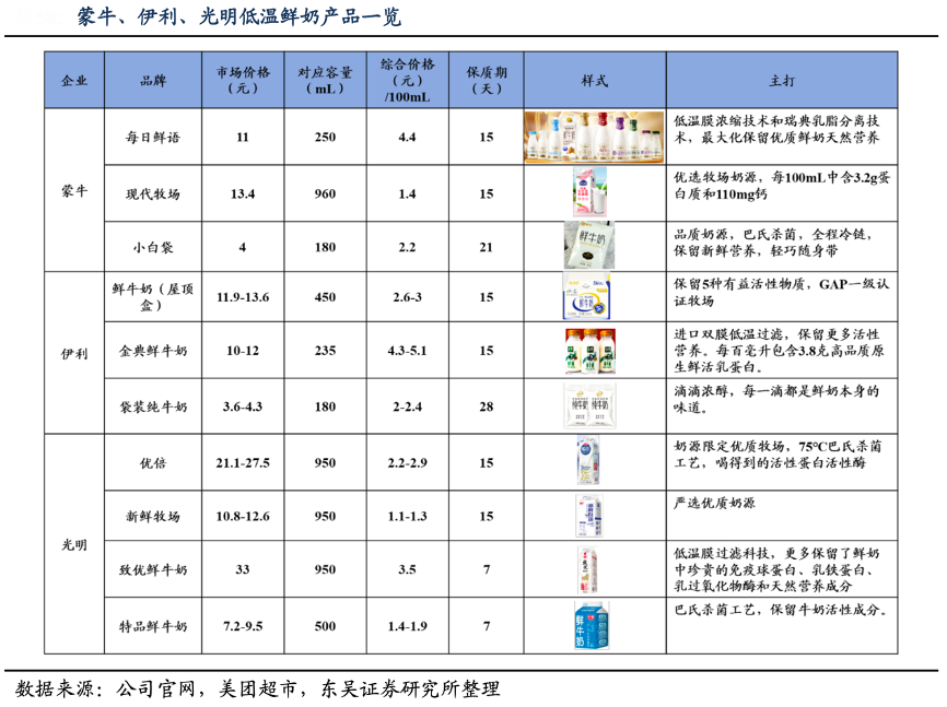 經典案例:根據公司官網、美團超市、東吳證券研究所等綜合資訊表明,全國乳企打造高端產品線,區域性乳企強調“鮮”價值。2018年,蒙牛和伊利相繼推出低溫鮮奶產品。蒙牛通過每日鮮語和現代牧場打造高端和中端產品線,按收入計 2021 年市占率達13.4%。光明旗下致優和特品保質期為 7 天,保留更多營養成分;新乳業開辟黃金 24 小時系列,強化極致新鮮理念。