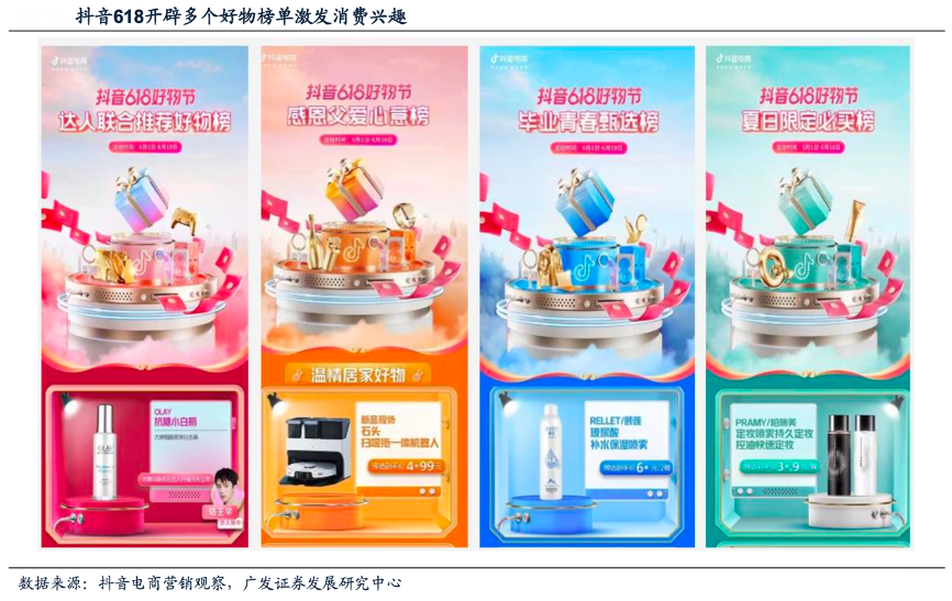 經典案例:根據抖音電商營銷觀察、廣發證券發展研究中心等綜合資訊表明,抖音618好物節推出的“好物推薦榜單”則以更直接的劃分興趣圈層的方式,將不同產品精細化種草給興趣人群,讓達人粉絲、畢業生、美食愛好者等興趣標簽群體有了更便捷的內容推薦和選購途徑。