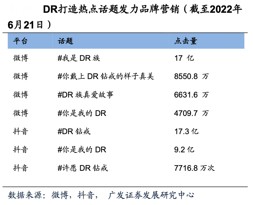 經典案例:根據微博、抖音、廣發證券發展研究中心等綜合資訊表明,DR品牌圍繞“一生只送一人”及“男士一生僅能定制一枚”的品牌理念和婚戒定制規則,賦予品牌“一生·唯一·真愛”的獨特情感內涵和價值主張,基于微博、抖音、快手等平臺線上私域流量運營為線下門店引流,通過打造熱點話題、推出系列情景短視頻、借助明星名人效應發力品牌營銷。
