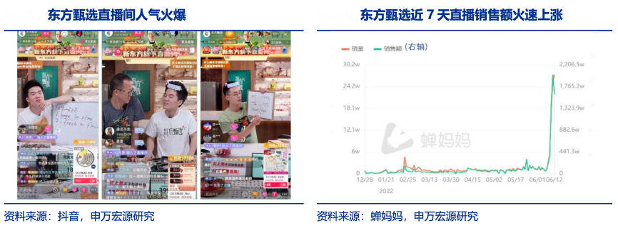 經典案例:根據抖音、蟬媽媽、申萬宏源研究等綜合資訊表明,6月 11 日新東方前英語老師董宇輝的一場牛排帶貨讓東方甄選直播間爆火出圈,單日銷售突破 2000 萬。據蟬媽媽數據,6 月 10 日至 13 日,東方甄選直播觀看人次均達 900 萬以上,6 月 13 日更是達到 1607.1 萬人, 抖音賬號粉絲從 110.8 萬人增長 242.5%至 379.5 萬人。東方甄選的出圈強勢拉動新東方股價上漲超 30%(6 月 14 日收盤價 VS 6 月 10 日收盤價)。