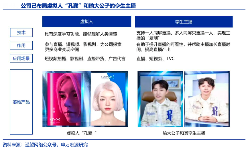 經典案例:根據遙望網絡公眾號、申萬宏源研究等綜合資訊表明,遙望網絡公司組建了 20 人的 CG 研發團隊在數字虛擬人領域進行研發與制作,2022 年 4 月,公司發布虛擬人“孔襄”,已與賈乃亮進行短劇合作,并接到適樂膚、薇姿、NYX 三個品牌的代言,數次登上社交媒體熱搜榜。