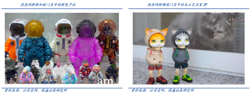 經典案例:根據公司官網、國盛證券研究所等綜合資訊表明,除自有產品外,泡泡瑪特會與本地潮玩 IP 展開合作,引入第三方特色產品于門店中銷售、展覽。其在韓國門店中亦設立本土藝術家專區,包含 DOTOY、Vicious Twin Bros 等作品。根據全天候科技報道,泡泡瑪特韓國門店售賣產品中,70%為自有IP,20%為當地采購的潮玩產品,10%為當地藝術家設計的商品。