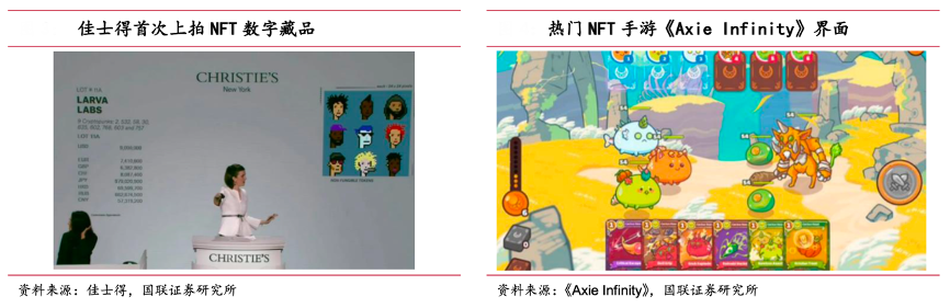 經典案例:根據佳士得、《Axie Infinity》、國聯證券研究所等綜合資訊表明,藝術藏品領域,全球頭部拍賣行佳士得、蘇富比相繼入局 NFT 數字藏品,其中佳士得 2021 年共售出超過 100 件 NFT 作品,交易額近 1.5 億美元,蘇富比 NFT 年 度交易額也接近 1 億美元。游戲領域,基于 NFT 的卡牌對戰游戲《Axie Infinity》出圈,其2021 年營收達 13 億美元。
