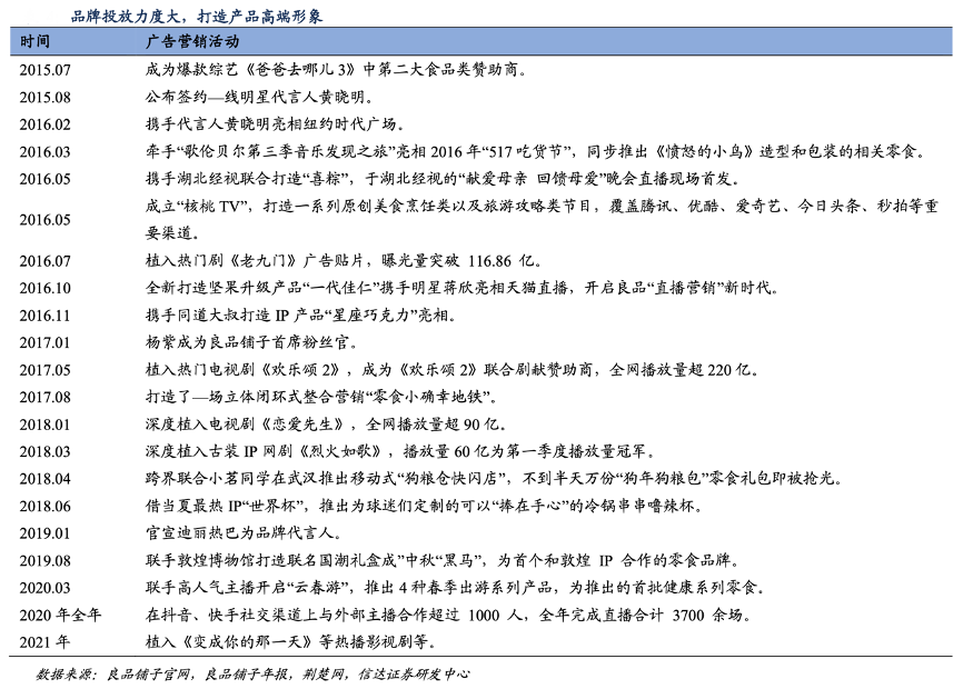 經(jīng)典案例:根據(jù)良品鋪?zhàn)庸倬W(wǎng)、良品鋪?zhàn)幽陥?bào)、荊楚網(wǎng)、信達(dá)證券研發(fā)中心等綜合資訊表明,良品鋪?zhàn)庸就ㄟ^影視作品植入、電視節(jié)目冠名等營造產(chǎn)品高端形象,終端通過店員培訓(xùn)、門店高端形象展示打造高端體驗(yàn)。其通過 “產(chǎn)品、傳播、體驗(yàn)”三位一體全面做實(shí)高端,賦予高品質(zhì)、高顏值、高體驗(yàn)的產(chǎn)品內(nèi)涵,高端零食形象有望率先搶占消費(fèi)者心智。