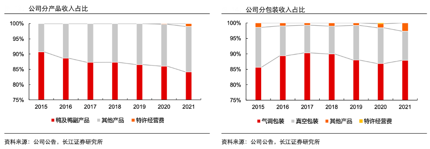 經(jīng)典案例:根據(jù)公司公告、長(zhǎng)江證券研究所等綜合資訊表明,周黑鴨公司產(chǎn)品結(jié)構(gòu)持續(xù)優(yōu)化,氣調(diào)包裝占比基本穩(wěn)定。其一直以來(lái)以鴨及鴨副產(chǎn)品為核心,最近幾年以來(lái)的收入占比略有下降,2021年收入占比 84.2%;其他產(chǎn)品收入占比從 2015 年的不足 10%提升至 2021 年的近 15%。公司新產(chǎn)品仍以氣調(diào)包裝為主。