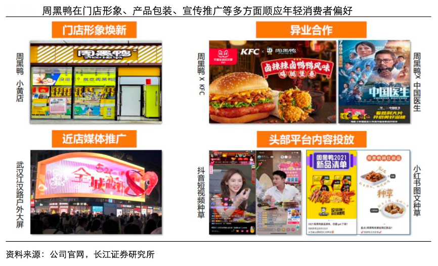 經(jīng)典案例:根據(jù)公司官網(wǎng)、長(zhǎng)江證券研究所等綜合資訊表明,周黑鴨新形象門(mén)店“小黃店”全國(guó)落地,以新潮、時(shí)尚的品牌調(diào)性引領(lǐng)年輕消費(fèi)者,加速推動(dòng)品牌年輕化。其在品牌方面,其積極探索跨界合作,與肯德基推出鹵辣辣鹵鴨鴨系列聯(lián)名產(chǎn)品,更符合消費(fèi)者需求,更受年輕消費(fèi)者青睞。