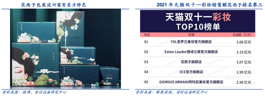CBO 數據顯示,2019 年花西子全網成交額達 11.3 億元,同比暴漲 25 倍,同時市占率位列中國彩妝第 10 名,2020 年全網成交額突破 30 億元,2021 年天貓雙十一銷售額 3.07 億元,位列彩妝類目第三,僅次于 YSL 和雅詩蘭黛。