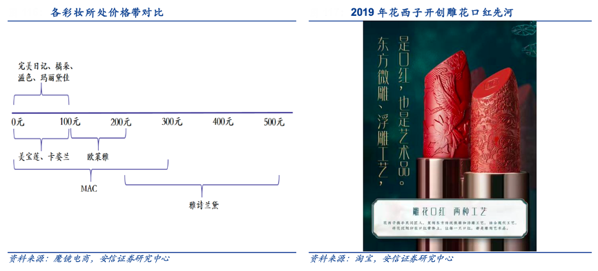 經典案例:根據微博、解數咨詢、安信證券研究中心等綜合資訊表明,花西子于 2017 年 3 月誕生,“西子”指西湖亦指西施,“花”蘊含了品牌理念“以花養妝”。其創始人花滿天(吳成寶)對花西子的市場定位是“彩妝+100~200 價格帶+ 有審美欲求(喜歡國風)+有一定消費能力”的人群。